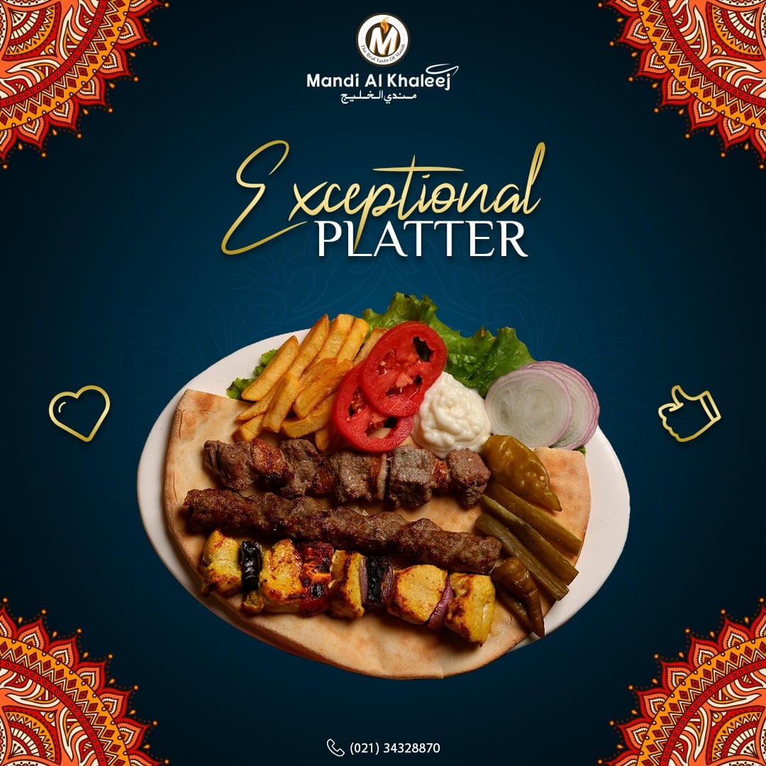 The journey begins 20 years ago when an optimistic Pakistani chef goes to Saudia Arabia to learn about new food traditions and taste. Food being his first love, he worked in different restaurants of the GULF for a period of 20 years and as every Pakistani wants to serve his country, he chose to serve them with the delicious quality food of GULF that they don't usually get in Pakistan. With the support of his children, he inaugrated the first restaurant in Karachi to serve the most popular dishes of Middle East. He named the restaurant 'Mandi Al Khaleej' (Mandi from Gulf) Maintaining the exact taste from Saudi Arabia, Mandi Al Khaleej is serving the top-quality arabic traditional dishes right in the heart of Karachi.
